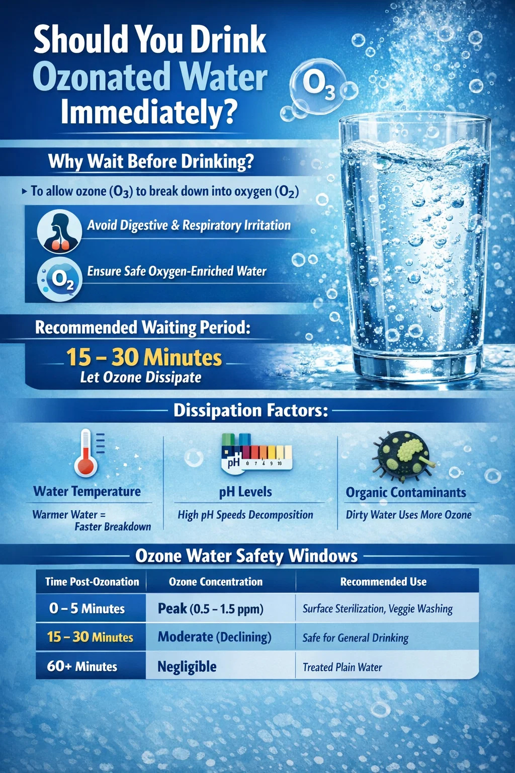 Kratak odgovor je ne, općenito biste trebali pričekati najmanje 15 do 30 minuta nakon procesa ozonizacije prije pijenja vode. Dok je ozonirana voda je izuzetno učinkovit kao dezinfekcijsko sredstvo , pijenje dok je koncentracija ozona na vrhuncu može dovesti do manje iritacije probavnog trakta ili dišnog sustava zbog ispuštanja plinova zaostalih molekula ozona.