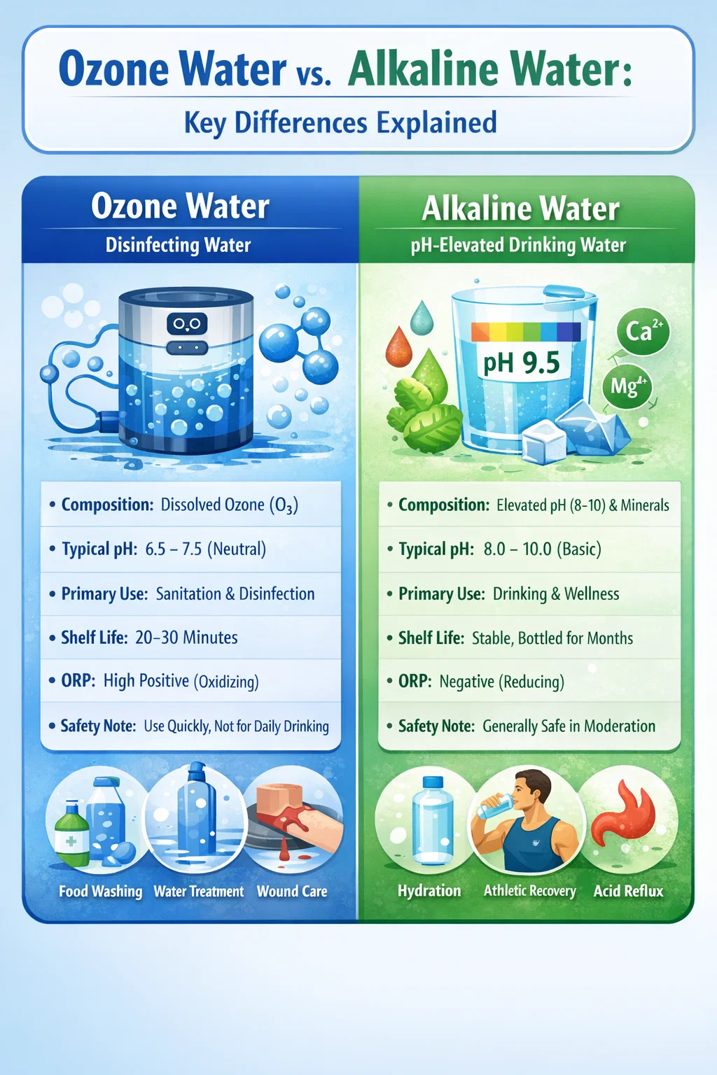 Ozonska voda i alkalna voda različiti su proizvodi s različitim kemijskim sastavom, različitim primjenama i različitim bazama dokaza. Ozonirana voda je snažno, kratkotrajno dezinfekcijsko sredstvo koje se najbolje koristi za sanitarne zadatke - pranje hrane, tretiranje površina i pročišćavanje vode. Alkalna voda je voda za piće s povišenim pH sa skromnim prednostima koje se još uvijek raspravljaju u vezi s hidratacijom i refluksom kiseline.