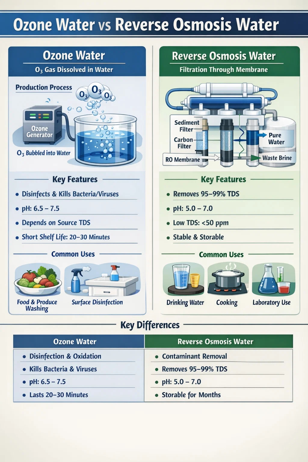 Ozonska voda i voda reverznom osmozom nisu iste i nisu međusobno zamjenjive. Ozonska voda je voda koja se koristi kao aktivno dezinfekcijsko sredstvo; RO voda je voda iz koje su kontaminanti fizički uklonjeni. Prvi djeluje kroz kemiju — oksidaciju i uništavanje mikroba. Drugi djeluje kroz fiziku — filtraciju pod pritiskom na molekularnoj razini.